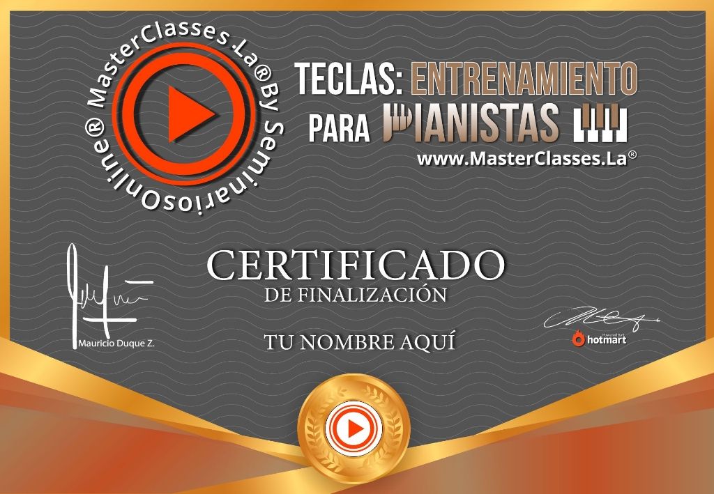 ¡Conviértete en un pianista experto con el Master Class TECLAS ENTRENAMIENTO PARA PIANISTAS! Aprenderás de forma práctica y teórica los fundamentos necesarios para dominar el piano. Obtendrás sólidas bases teóricas y prácticas, mejorarás el movimiento de tus dedos, aprenderás a leer ritmos y notas, formar escalas y acordes, y entenderás la importancia de integrar los elementos musicales. Además, aumentarás tu conexión y sensibilidad con la música. ¡Obtén tu certificado avalado por Hotmart y Seminarios Online! No pierdas la oportunidad de aprender de la mano de un experto pianista con más de 8 años de experiencia. ¡Inscríbete ahora!